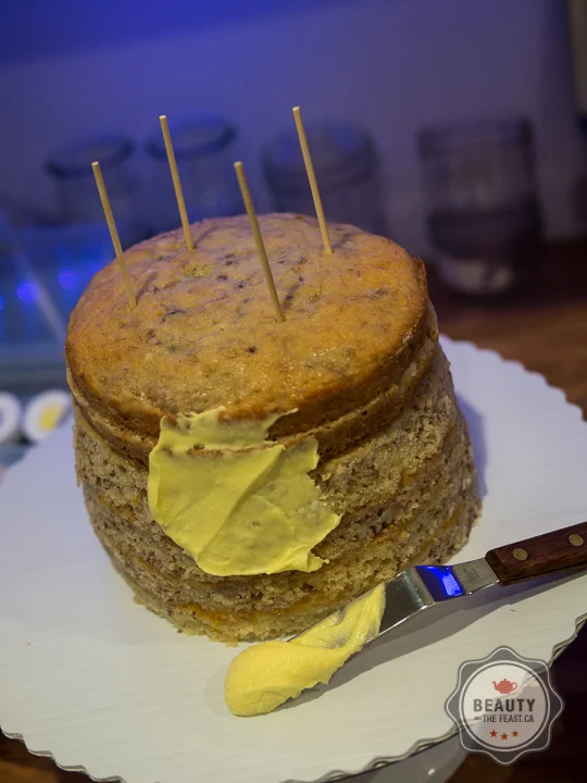Stack the 6 inch slices on the bottom, and the 4 inch slices on the top. I used Peach Ginger Wine Jam. You can put in a few bamboo skewers through the middle for stability if you like.