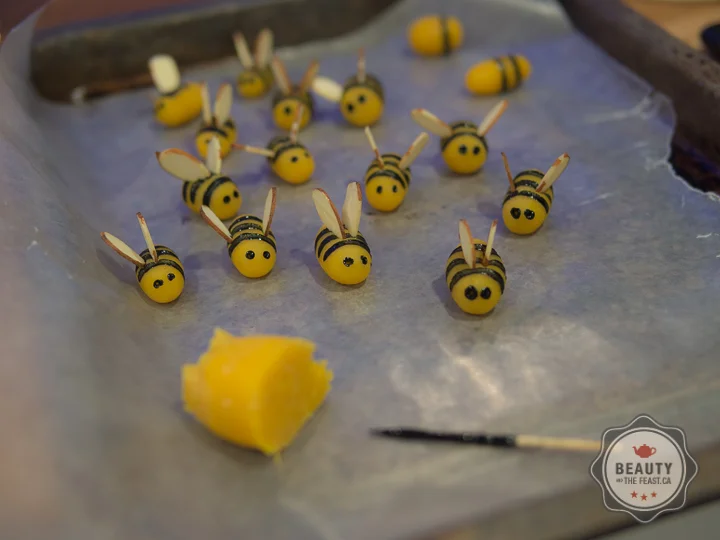 I've seen people paint on the black lines with a brush but I applied the stripes by rolling the pill with a dye coated toothpick because it was easier for me. Add sliced almonds for the wings, then use the tip of the toothpick to do the eyes. Allow to dry over night on a sheet of wax paper.