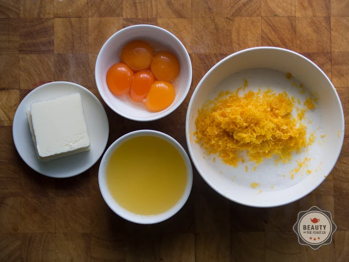 We begin with the ingredients... Great lemon curd requires the fresh eggs with the orange-st yolks you can find! This recipe is from Food in Jars by Marisa McClellan.