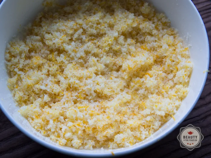Combine the lemon zest and the sugar in small bowl. It will smell heavenly. Do not be distracted. We have a job to do. Rub the zest and sugar together between your finger tips until it is fragrant and combined.